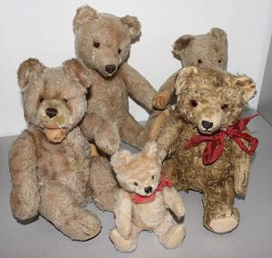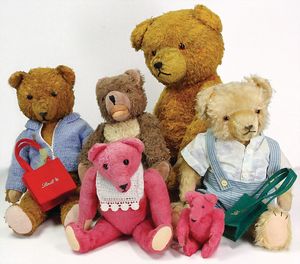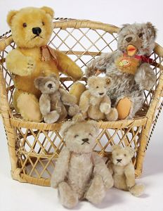 Konv. Steiff u. andere Bären, 50er/60er Jahre, Zotty Hermann Bär, Zotty liegend, 9 Teile, bespielt, Mecki u. Micki