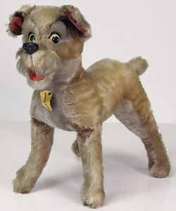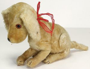 Konv., Steiff Molly, 10 cm, Vorkrieg, sehr stark abgeliebt, ohne Knopf, Porzellan-Hund, jünger, kl. Steiff Bär, 60er Jahre, Köhler Vogel, kl. Geburtstagsbuch, kl. Zebra-Wagen, Blech, neuer, Kleinteile