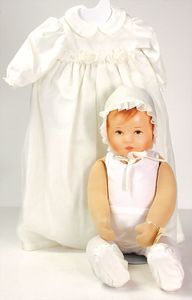 2 Teile Kinderkleidung, 1 altes Taufkleid, 1 x Baumwoll-Sommerkleid, dazu 1 Hermelin-Kragen, kl. Puppenmantel mit Haube, Samt, Fell besetzt, für ca. 38 cm – 40 cm Puppe, 1 Puppendeckel-Korb