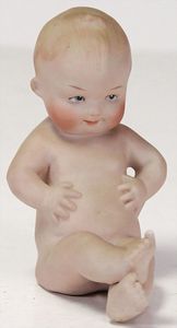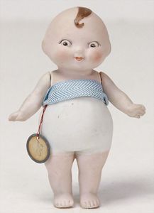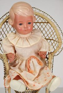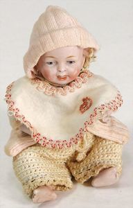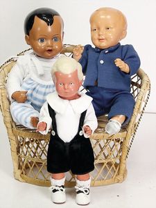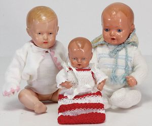 3 Teile Celluloid, Schildkröt, Bebi, 1925, 24 cm, fester Kopf, blaue gemalte Augen, bewegl. Arme u. Beine, 1 Celluloid-Strampelchen, 22,5 cm, fester Kopf, fest eingesetzte blaue Glasaugen, bewegl. Arme u. Beine, selten in dieser Ausführung, 1 kl. Celluloid-Strampelchen, 14,5 cm