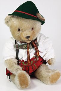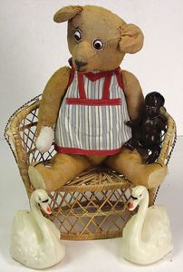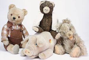 Konv., Hermann Zotty, Hermann Bär, 48 cm, Tatzen übernäht, 1 Bär Holzwolle gestopft, 50er/60er Jahre, 1 Steiff Schwein, Molly, neuere Produktion, Knopf, Schild u. Fahne, 43 cm