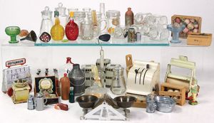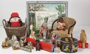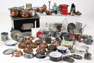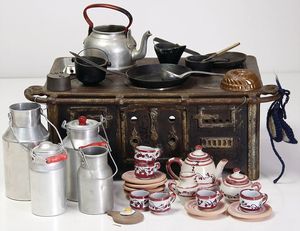Puppenherd, Guss, Länge 29 cm, Höhe 14 cm, Tiefe 21 cm, 1 Ofenklappe, 5 Herdplatten, 3 davon abnehmbar, dazu einige Teile Puppengeschirr, 2 Pfannen, 1 Wasserkessel ohne Deckel, einige Teile Keramik, Puppen-Kaffeeservice, 4 Milchkannen, Weißblech, 2 x mit Deckel