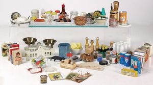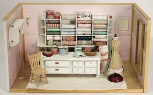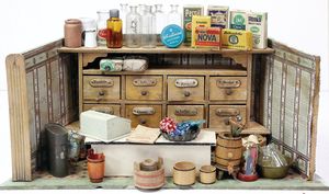 Kaufladen, 48 cm breit, 19 cm hoch, Schubladen mit Papierschildern, Orig.-Tapete an Wand u. Boden, reichh. Zubehör