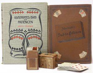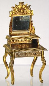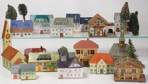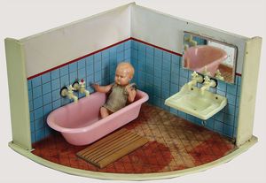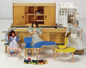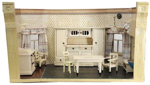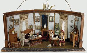 schöne Reise-Puppenstube, zerlegbar, 72,5 cm breit, 33 cm hoch, 35 cm tief, 2 Fenster, Spiegel, Orig.-Tapete an Wand u. Boden, fest eingebauter Spiegel, Orig.-Bemalung außen, 2 kl. Verzierungen oben fehlen, möbliert, reichh. Zubehör, mit Puppen, schöner Orig.-Zust.
