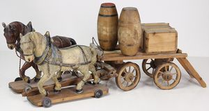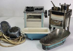 2 Puppenherde, Höhe 17 cm, 1 x mit Topf u. Pfanne, ungemarkt, 1 x ohne Töpfesatz, dazu elektr. Puppen-Waffeleisen, 2 Puppen-Badewannen, 1 x Guss, 1 x Blech lithogr., altersbed. Farbabplatzer, 17 cm u. 20 cm