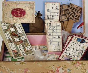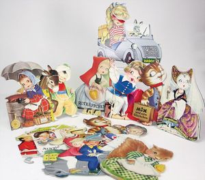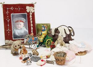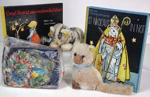 Fundkiste, 2 Kinderbücher, „Gretel Pastetel, was machen die Gänse“ von Helen Fischer, „Sankt Nikolaus in Not“ von Felix Timmermans, 2 Steiff Katzen, weich gestopft, mit Knopf u. Fahne, 100 alte Oblatenbilder von 1900 – 1930