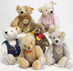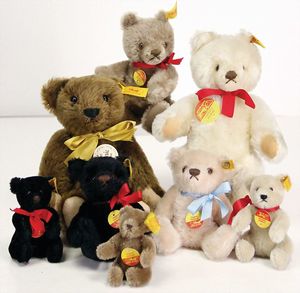 Konv. Steiff Klassik-Bären, 8 Teile, 10 cm – 22 cm, Klassik-Bär 1909, Maskenbär, versch Gr., Orig.-Teddys, versch. Farben u. Gr., sehr guter Zust., mit Knopf, Schilld u. Fahne