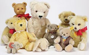 Konv. Steiff, Bären u. andere, Klassik Bär 1909, Maskenbär, Replika, Brummbär, Bär mit aufgemalten Tatzen, dazu 1 Steiff orig.-Bär, gelb, 23 cm, 1 Künstlerbär, Hersteller?, kl. Elefant, 1 Bär, 50er Jahre, 1 Schildkröt Bär Vinyl