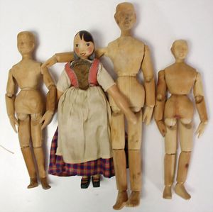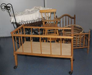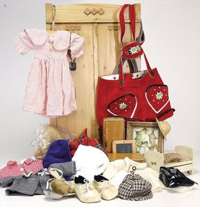 gr. Konv. Puppenkleidung, meist 50er Jahre, kl. Puppenbett, Schränke, 1 Weichholz-Kleiderschrank, 58 cm, bitte besichtigen