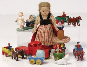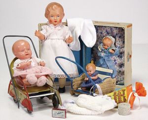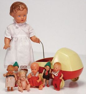 SCHILDKRÖT Ursel, 22 cm, neuer, 1 Kinderwagen, Korb, 50er Jahre, 1 Kinderwagen, Blech, außergew. Form, 50er Jahre, kl. Schildkröt Celluloid-Strampelchen, 15,5 cm, 2 kl. Masse-Puppen, Kleidung, Kleinteile