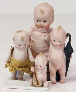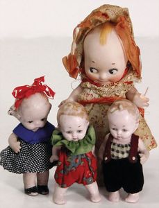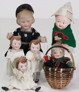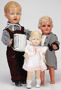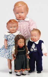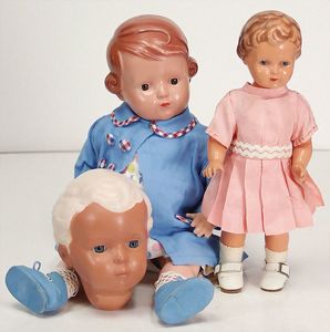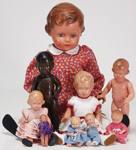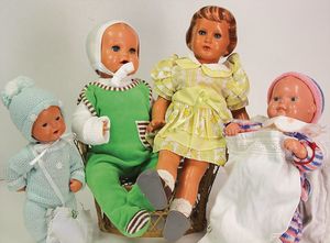 2 x Inge, Celluloid, 17 ½ u. 15 1/2 cm, 3 x Strampelchen, Kunststoff, 1 x Schildkröt Ursel, Kunststoff, 1 x Cellba, fabriger Junge, 18 cm, fester Kopf, 1 x Ursel, Körper nicht zum Kopf passend, 41 cm, Glasaugen