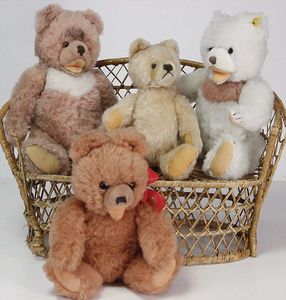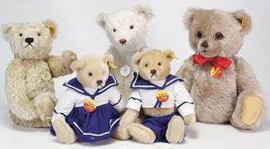 STEIFF Konv. 5 Teile Klassik Bären, 27 cm – 33 cm Klassik Bär 1920, Teddybär 1921, weiß, Brummbär, 2 x Bär mit Matrosenanzug, Junge u. Mädchen, Knopf, Schild u. Fahne, Zertifikat des weißen Bären, sonst ohne Zertifikat u. ohne Kart.