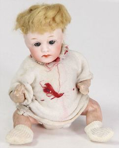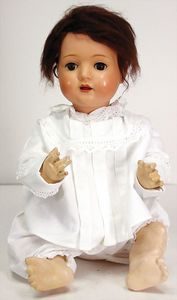 BRUNO SCHMIDT Celluloid, Baby, 60 cm, Kurbelkopf, braune Schlafaugen, Perücke wurde nicht entfernt, Transportrisiko für Augenmechanismus beachten, off. Mund, Zunge, Masse-Sitzbabykörper, Hände u. Füße ausgebessert