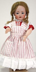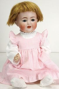 ARMAND MARSEILLE 390, 27 cm, Biskuit-Kurbelkopf, blaue Schlafaugen, off. Mund, Zähne u. Zunge, Gliederkörper, mit langen Oberschenkeln, Echthaarperücke, dazu 1 x K&R 126, Ausbruch am Hinterkopf, 1 Auge restauriert, 40 cm, Sitzbabykörper