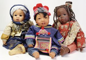 GÖTZ 3 Künstlerpuppen, Vinyl, Stoffkörper, weich gestopft, Vinyl-Arme u. –Beine, 2 x 52 cm, 1 x 60 cm, bespielt