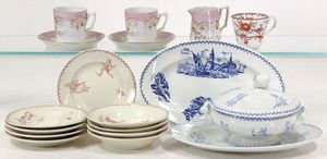 Konv. Kindergeschirr, Einzelteile, darunter Suppenterrine, gemarkt Passe Tempf o&c?, Durchm. 13 cm, dazu 1 Fleischplatte, 2 Fleischplatten 20 cm, 9 Teller, versch. Motive, 2 kl. Kaffeetassen, Untertassen, Milchkännchen, 1 handbemalte kl. Tasse Aufschrift „Sarreguemines francais?“