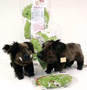 2 Plüsch-Wildschweine, Firma Kösen, 40 cm, unbespielt, dazu 3 x Käthe Kruse, Babykleidung, Overalls, grün, neu, 1 x für 28 cm – 33 cm, 38 cm – 43 cm, 1 x 47 cm – 50 cm
