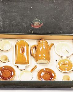 altes Kinder-Tongeschirr, honigfarben lasiert, Firma Alfred Dietze, Kaffeekanne, Höhe ca. 11 cm, Orig.-verpackt