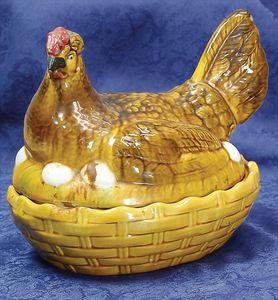 Blech, Keramik-Deckelschale, Deckel in Huhnform, Keramik mit 6 Eierbechern, Schale geklebt, Deckel u Einsatz gut, dekorativ