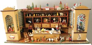 Puppenstubenkaufladen, Gründerzeit, 55 cm breit, 30 cm hoch, Schaufenster, Schubladen, Orig.-Theke, schöne Balkenwaage, einige Zubehörteile, jünger, Orig.-Tapete an Wand u. Boden, schöner Orig.-Zust.