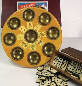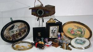 Puppenstuben-Ausschmückungsteile, darunter einige Bilderrahmen, versch. Gr., Kuckucks-Uhr, Kohlekasten, kl. Keramik-Gläschen, kl. Dominospiel in Holzkästchen, Bein, u. anderes