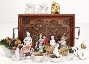 Konv. Nippesfiguren, 2 Porzellan-Vasen, 8 cm, 3 kl. Porzellan-Tassen, handbemalt, dazu 1 Holz-Tablett, mit Schnitzerei, Länge 21 cm