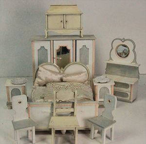 Puppenstuben-Schlafzimmerprogramm, Holz, Alter?, komplett überstrichen, Kleiderschrank, Höhe 21 cm, Doppelbett, 2 Nachtschränkchen, Spiegelschrank, Kommode, 3 Stühle