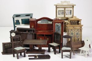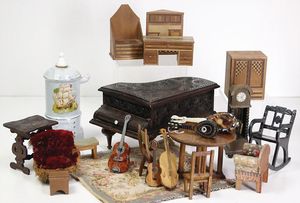 Konv. Puppenstuben-Ausschmückungsteile, versch. Einzelteile, Standuhr, Höhe 15 cm, 1 Geschenkdose, Holz, in Form eines Klaviers, Länge 21 cm, 2 Sessel, 1 x Samt bezogen, 1 Keramik-Puppenofen, Höhe 20 cm, u.. anderes, einige Puppen-Musikinstrumente