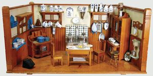 Puppenstubenküche, 78 cm breit, 38,5 cm hoch, möbliert, reichh. Zubehör, blau/weiß emailliert, Porzellan blau/weiß, dekorativ, lackiert, unten vertäfelt, schöne Gr., ca. 1910