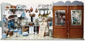 Puppenstubenküche, mit Vorratskammer, 1,06 m breit, 48 cm tief, alte Bemalung, Durchgangstür, Vorratskammer mit Fronttür, reichhaltig Zubehör, ca. 200 Teile, Kupfer, Messing, Blech, Porzellan, Keramik, Holz, sehr dekorativ, mit Puppe