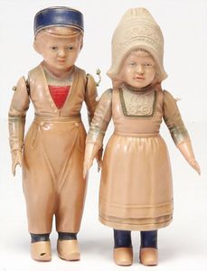 2 Teile Celluloid-Brustblattkopf-Puppen, 46 cm, Wachstuch-Körper, gegliederte Masse-Arme, braune Schlafaugen, Perücke wurde nicht entfernt, Transportrisiko für Augenmechanismus beachten, 1 Celluloid-Brustblattkopf, blaue Schlafaugen, Augenmechanismus hängt, Wachstuch-Körper, Celluloid-Arme, Masse-Beine, Perücke wurde nicht entfernt, Transportrisiko für Augenmechanismus beachten