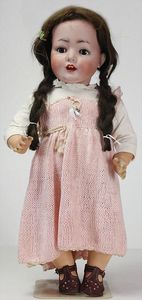 HEUBACH 342, Biskuitporzellankopf-Puppe, 40 cm, Kurbelkopf, braune Schlafaugen,, off.. Mund, Zähne u. Zunge, Körper farbl. überarbeitet, Perückenpull