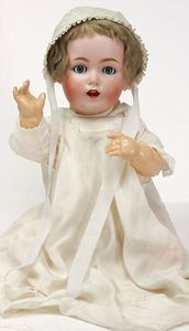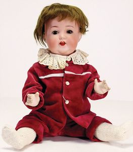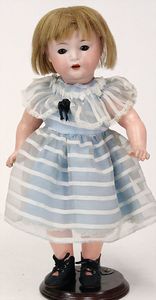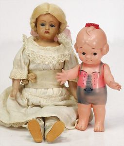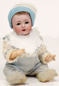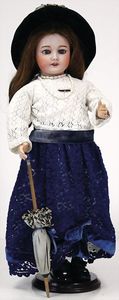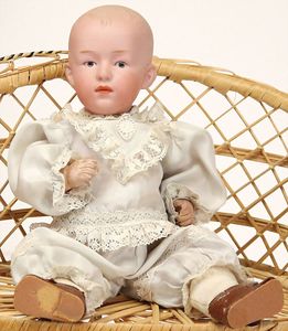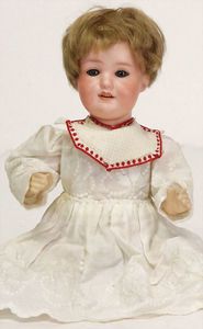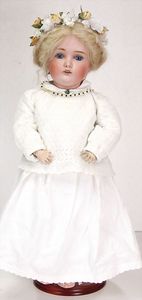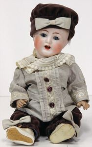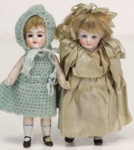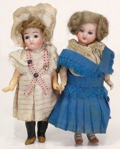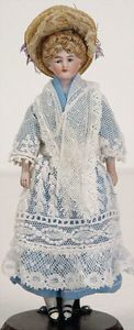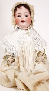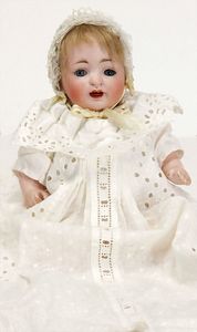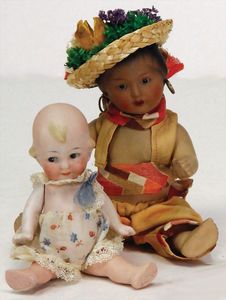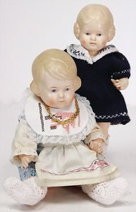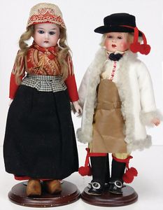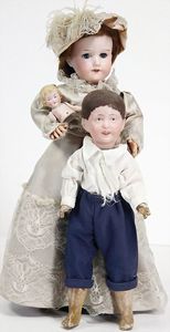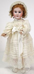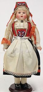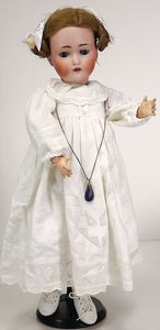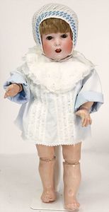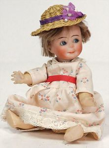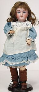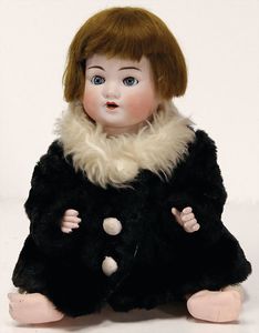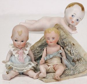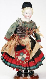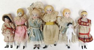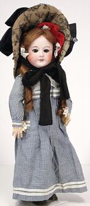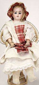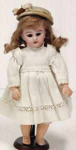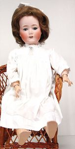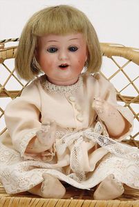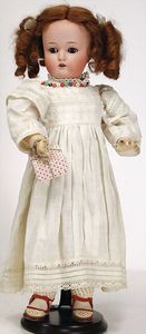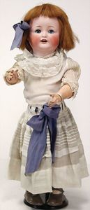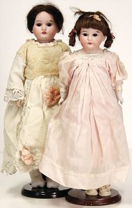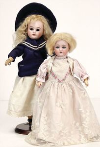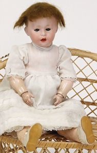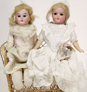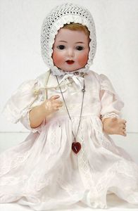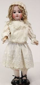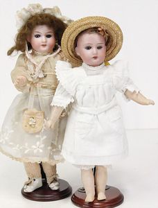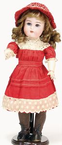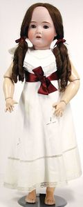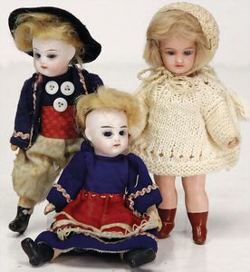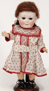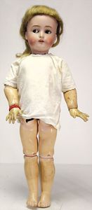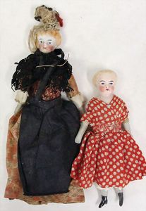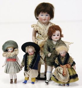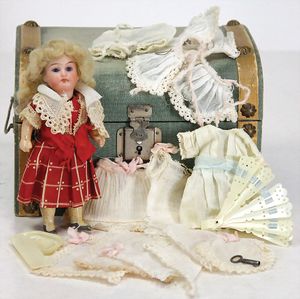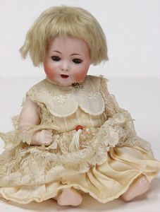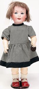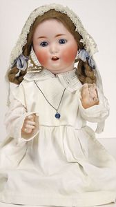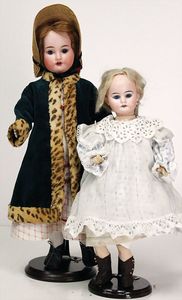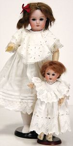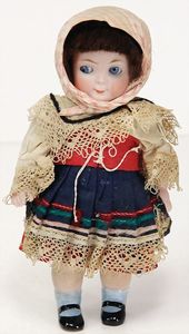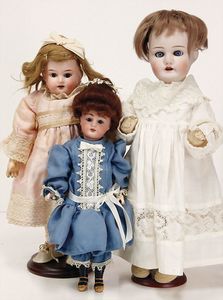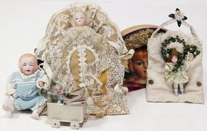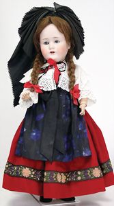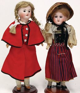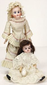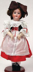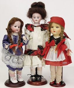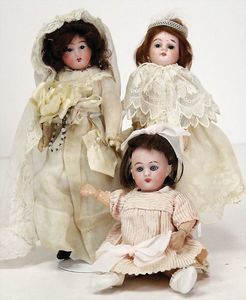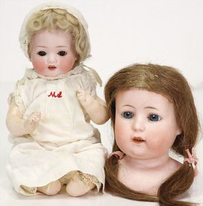 SIMON & HALBIG Biskuitporzellanbrustblattkopf-Puppe, 30 cm, blaue fest eingesetzte Glasaugen, off. Mund, Zähne oben, durchst. Ohren, Lederkörper, Biskuitunterarme, Perücke neuer, 1x Biskuitporzellankopf-Puppe, Heubach 250, braune Schlafaugen, off. Mund, Körper neuer, 27 cm, 1x Massepuppe, AM 378, Rotkäppchen, 27 cm, blaue Schlafaugen, geschl. Mund, Orig.-Perücke, Orig.-Kleidung, Stoffkörper, Massearme