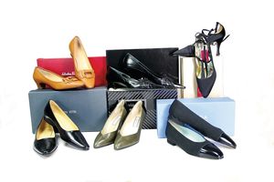 großes Konv. hochwertige Damenschuhe, Christian Lacroix Paris, Gr. 37,5, schwarze Halbpumps, dazu ein Paar Belmondo, Gr. 38, made in spain, Salvatore Ferragamo, ockerbraun, Gr. 8,5, ungetragen, im Orig.-Karton, 1x Ludwig Reiter, Schuhmanufaktur, made in italy, Gr. 39, im Orig.-Karton, leichte Gebrauchsspuren an der Sohle, 1x Gianni Versace, Gr. 37, grün, Pumps, 1x P.Verdi Paris, Ballerinas mit Pfennigabsatz, schwarz Gr. 38,5, made in italy, neuwertiger Zust.
