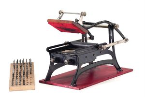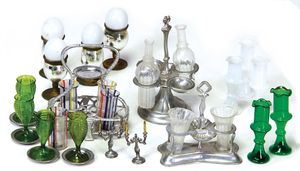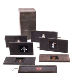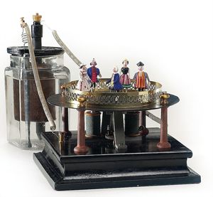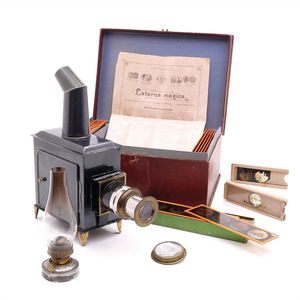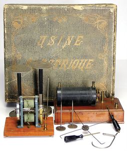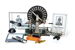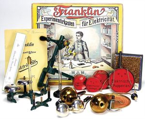 Konv., 1 x Wimshurstmaschine (Influenzmaschine), um1910, 283 x 315 x 150 mm, guter Zust., kl. Altersspuren, ein Teil der Staniolsegmente fehlt, Kurbel und Lederriemen womöglich ersetzt, 1 x Anleitungsheft zu Voltana-Maschine (Influenzmaschine), 1921, sehr guter Zust., 1 x Röntgenröhre, Nachbauten nach Katalogabbildung von 1909, um1910, 210 x 185 x 130 mm, guter Zust., kl. Gebrauchsspuren, Stativ und Stativklemme Nachbauten, dazu Materialien zu Röntgenröhre, 1990 – 2003, sehr guter Zust., Klebespuren, 1 x Blitztafeln, um 1910, guter bis sehr guter Zust., leicht bespielt, Stativ mit Stativklammern passender Nachbau, 1 x Funkeninduktor, Frankreich, Paris, 1900 – 1910, guter Zust., auf Funktionsfähigkeit nicht geprüft, leicht bespielt, ohne Ketten
