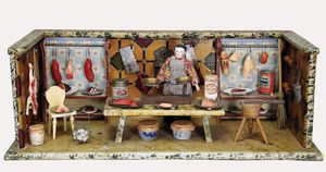 Puppenstube, Metzgerei, 52 cm breit, 22 cm tief, 22 cm hoch, ausgefallene Außenbemalung, reichh. Zubehör, 1 Puppenstubenpuppe, glasiertes Porzellan, 16 cm, Porzellan-Unterarme sowie -Unterschenkel, ausmodellierte Schuhe, Stoffkörper