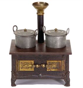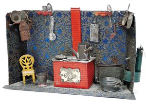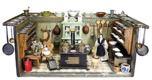 frühe Puppenküchen, mit Innenbemalung sowie seltener Außen-Blechablage, 69 cm breit, 40 cm tief, 28 cm hoch, mit reichh. Zubehör, frühe Zinnteller, 1 Petroleum-Ölkanne, 1 Puppenstubenpuppe, glasiertes Porzellan, Brustblattkopf, ausmodellierte Haare, lange Porzellan-Unterarme, ausmodellierte Schuhe u- Strümpfe, Stoffkörper, 18 cm, dekorativ, schöne Gr.