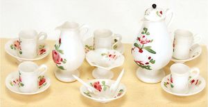Biedermeier Kaffeeservice, aus Milchglas, handbemalt, 6 Tassen, Unterteller, Milchkännchen, Teekanne