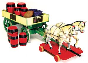 Pferdefuhrwerk mit Orig.-Fässern, Stuttgarter Brauerei Dinkelacker, Pferde auf Holz montiert, Holzplatte L: 33 cm, B: 24 cm, handbemalt, dazu 2 Holzwagen, 48 cm lang, 29 cm breit, 27 cm hoch, Fässer in untersch. Gr., 12 cm – 15 cm, guter Zust., schöne Dekoration