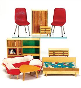 50er Jahre Ausschmückungsteile für Wohnzimmer, Möbelprogramm, 2 x Designer Stühle, H: 15 cm, Bett, Couchtisch, sowie Schränke
