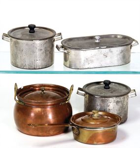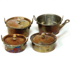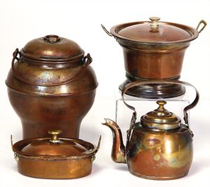 4 Teile Kupfer, 1 Wasserbehälter, H: 9 cm, innen verzinnt, Schüssel mit Deckel, Durchm. 7,5 cm, 1 Wassertopf, 1 Bräter mit Deckel, innen verzinnt