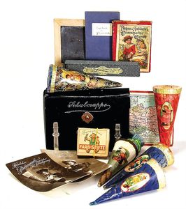 Schulutensilien, 4 Schultüten, Pappe u. Krepp, 15 cm, einige Schulbücher, 1 Schulranzen, 14 x 11 cm