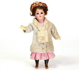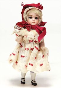 Puppenstubenpuppe, Ganzbiskuit, Mädchen, bewegl. Kopf, Arme u. Beine, ausmodellierte Schuhe u. Strümpfe, wohl alte Kleidung, 12 cm, fest stehende braune Glasaugen, geschl. Mund, Chip am linken Oberschenkel