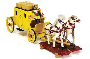 Holz-Postkutsche, handbemalt, L: 40 cm, H: 21 cm, 2 Filz-Pferde auf Holzplatte montiert, Holzräder, H: 25 cm, dekorativ