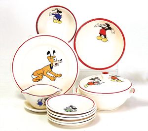 seltenes Puppengeschirr, „Mickey Mouse“ 30er Jahre, 5 Teller, Sauciere, 2 Schüsseln, 1 gr. Servierteller, Aufdruck Pluto, 1 Suppenterrine, Durchm. 10 cm, Durchm. Teller 9 cm, sehr schönes ausgefallenes Konv.
