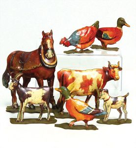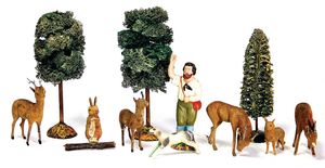 Konv. Wildtiere, Masse, 7 Teile, Rehe, Hase, Fuchs, 1 Jagdhund, dazu 1 Wanderer, H: 10,5 cm, 3 Luffa-Bäume, guter Zust.