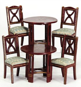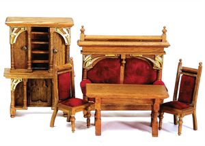 Möbelprogramm für Puppenstube, 5 Teile, Jugendstil, Holz, 1 Esstisch, L: 15,5 cm, 2 Stühle, H: 13 cm, mit rotem Samt bezogen, 1 Sofa, 1 Schrank, mit Messing/Blech vergoldeten Ornamenten