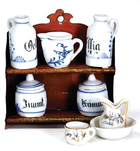 Puppenstuben-Ausschmückungsteile, Blech-Regal mit Porzellan-Gewürzdosen, Öl u. Essig, 12 cm breit, 13 cm hoch, dazu 1 Waschset, Porzellan