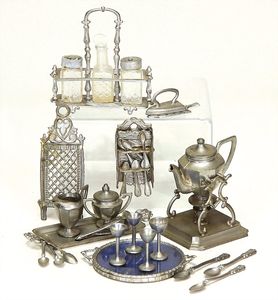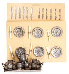 Konv. Zinn, Teller mit Serviettenringen, sowie Besteck, Gabel u. Messer, dazu 1 Teeservice auf Tablett, 4 Tassen, 4 Untertassen, Milchkännchen, Zuckerdose, Teekanne