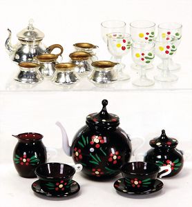 Puppenstuben-Ausschmückungsteile, Glas-Service, untersch. Design, 1 Teeservice, silber, 1 schwarzes Service, 1 x nur Gläser, schönes Konv.